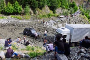 The journey took a challenging turn when we encountered a rockfall that blocked the road. A car had gotten stuck in the rock-strewn mud, causing a massive traffic jam. Drivers and passengers gathered around, some offering help and others simply waiting. After some effort, a truck arrived to pull the stuck car free, clearing the way for the long line of vehicles behind it. The camaraderie and teamwork among strangers in such remote conditions were heartwarming.