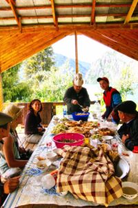 When we reached the lake, we were tired and hungry from the hike, and luckily, the local tourists by the shore came to our rescue. In true Kyrgyz hospitality, they invited us to join their meal without hesitation. Their warmth was undeniable—they wouldn’t let us leave the table until every dish was finished! Between bites of delicious local food and shared laughter, it felt like we had found an unexpected family away from home.
