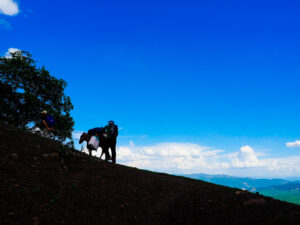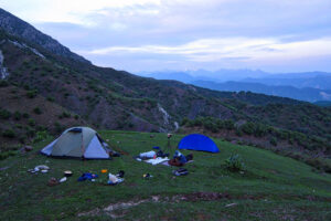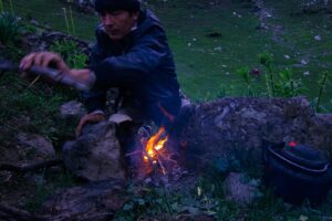 Our first day ended at a breathtaking campsite perched on a ridge with sweeping views of the surrounding valleys. Just as we began setting up our tents, a group of horses wandered over, as if to welcome us. They stood quietly nearby, their silhouettes against the golden light of the setting sun making for a magical moment.